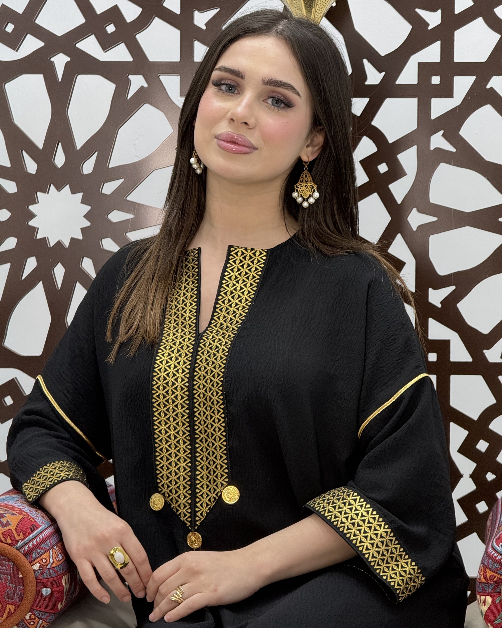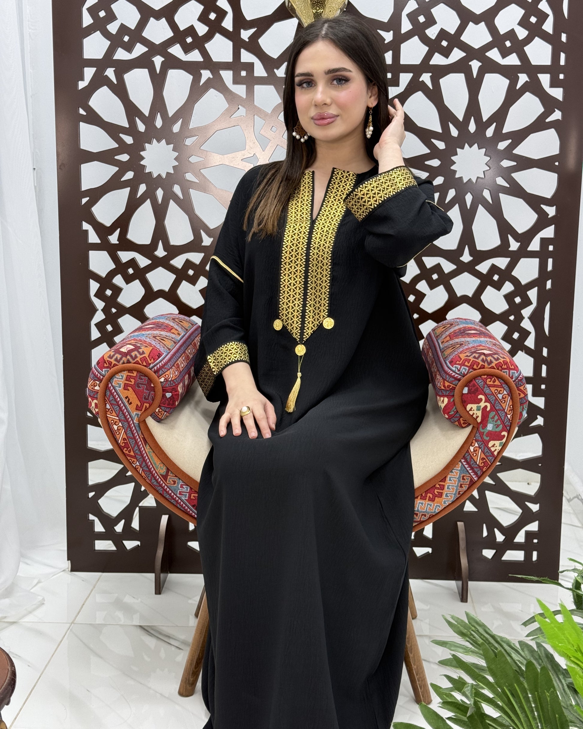 فستان Lune — إصدار محدود يجمع بين سحر الخامة الفاخرة وجمال التطريز الذهبي اليدوي. تصميم انسيابي يمنحكِ قواماً ملكياً في كل مناسبة، من الأعياد إلى الحفلات الراقية. خيط ذهبي دقيق، أزرار تقليدية، وشراشب تُكمل اللمسة الأنثوية بأناقة لا تُضاهى.